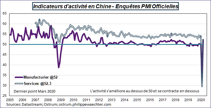 Les indices d’activité chinois ont rebondi en mars. L’indice du secteur manufacturier est ainsi passé de 35.7 en février à 52 en mars et celui des services de 29.6 à 52.3.
