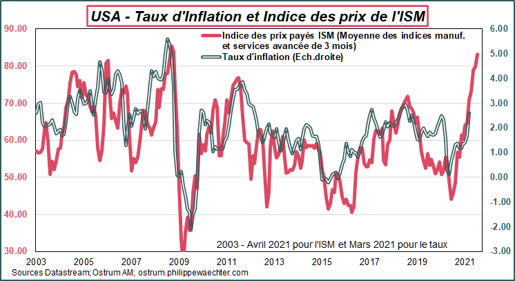 La publication des enquêtes ISM aux USA suggèrent que l’inflation va encore s’accélérer nettement. L’indice des prix payés est désormais cohérent avec un taux d’inflation supérieur à 4%.