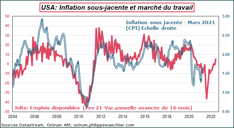 Sur ce graphe figure également, l’indicateur des emplois disponibles issu de l’enquête Jolts. Les deux indicateurs suivent des trajectoires proches mais le décalage entre les deux séries indique que les tensions sur le marché du travail ne se traduisent en pressions sur les prix qu’avec du retard.