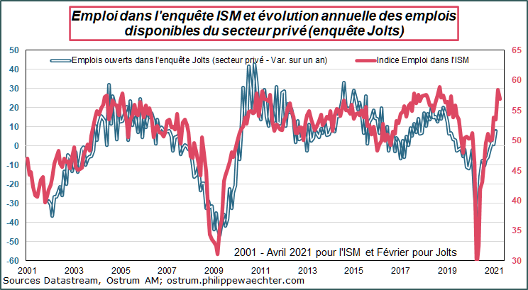 Cet équilibre va changer dans les prochains mois. L’indice de l’emploi dans l’enquête ISM, calculé comme la moyenne des secteurs manufacturier et non manufacturier, permet d’anticiper une forte accélération des emplois disponibles et en conséquence l’apparition de tensions sur le marché du travail.