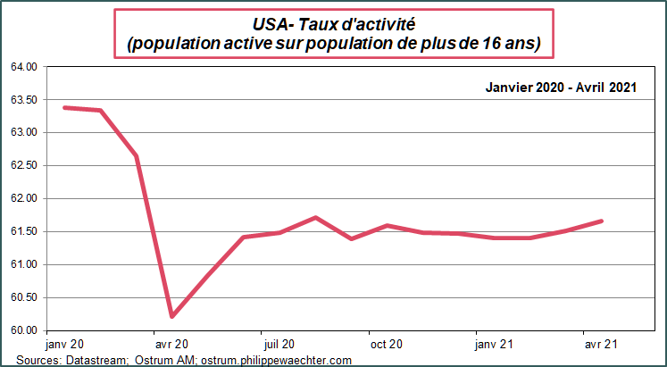 En effet, en dépit de leur optimisme sur le marché du travail (voir ici) les américains ne se hâtent pas de revenir sur le marché du travail. Le taux d’activité est encore bien en-dessous du niveau d’avant crise et ne présente pas de dynamique de rattrapage. Le risque est un déséquilibre entre les besoins des entreprises et des ménages qui ne se précipitent pas sur le marché du travail.