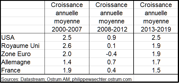 Lors de la récession de 2008/2009, par exemple, le taux de croissance est très vite revenu sur le niveau moyen d’avant crise. Il n’y a pas d’effet de rattrapage durable. Le tableau en annexe présente les métriques autour de la crise financière.