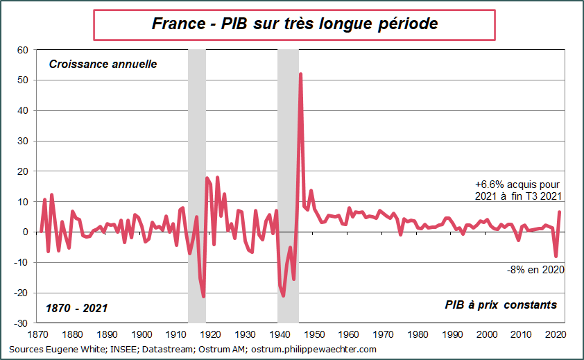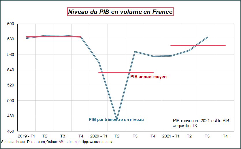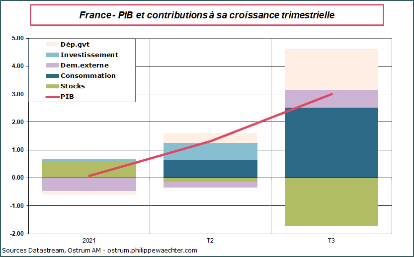 Le PIB français a progressé de 3% au cours des 3 mois d’été 2021. L’acquis de croissance pour 2021 est de 6.6% à la fin du mois de septembre, et l’acquis pour 2022 est déjà de 1.8%. Sur un an, l’activité est en hausse de 3.3%.