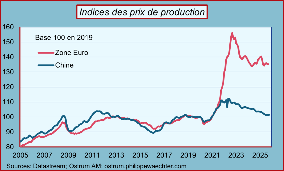 Par rapport à la zone Euro, les prix chinois sont très compétitifs. Sur une base 100 en 2019, l’indice des prix de production en Chine est à 101.4 alors qu’en zone Euro il est à 135 en septembre.