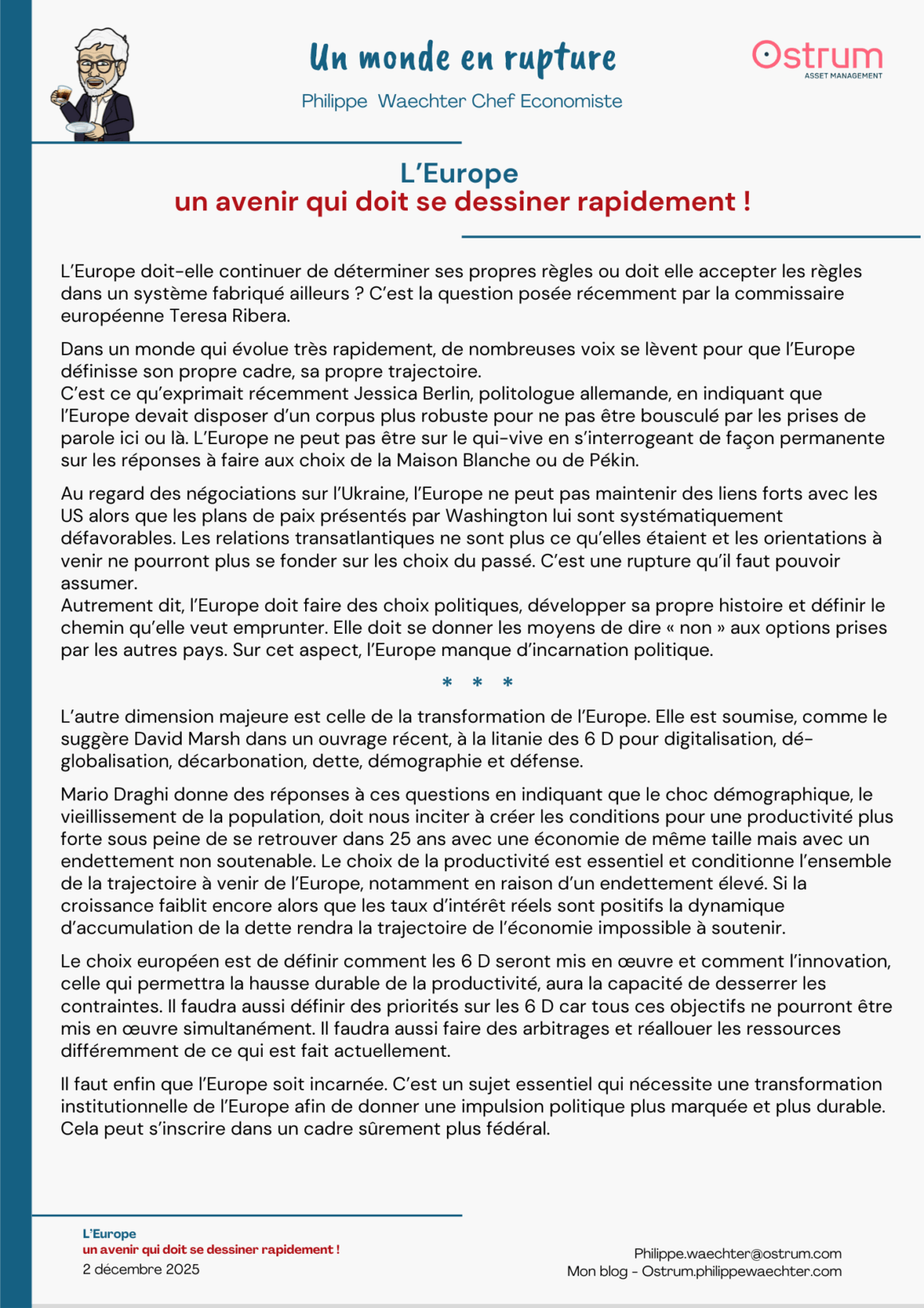 L’autre dimension majeure est celle de la transformation de l’Europe. Elle est soumise, comme le suggère David Marsh dans un ouvrage récent, à la litanie des 6 D pour digitalisation, dé-globalisation, décarbonation, dette, démographie et défense.