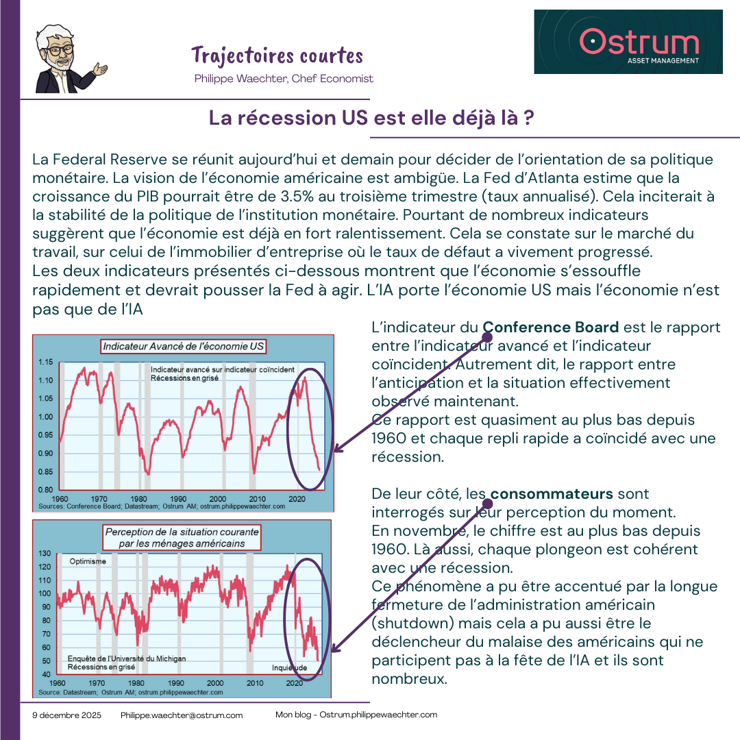 La Federal Reserve se réunit aujourd’hui et demain pour décider de l’orientation de sa politique monétaire. La vision de l’économie américaine est ambigüe. La Fed d’Atlanta estime que la croissance du PIB pourrait être de 3.5% au troisième trimestre (taux annualisé). Cela inciterait à la stabilité de la politique de l’institution monétaire. Pourtant de nombreux indicateurs suggèrent que l’économie est déjà en fort ralentissement. Cela se constate sur le marché du travail, sur celui de l’immobilier d’entreprise où le taux de défaut a vivement progressé.