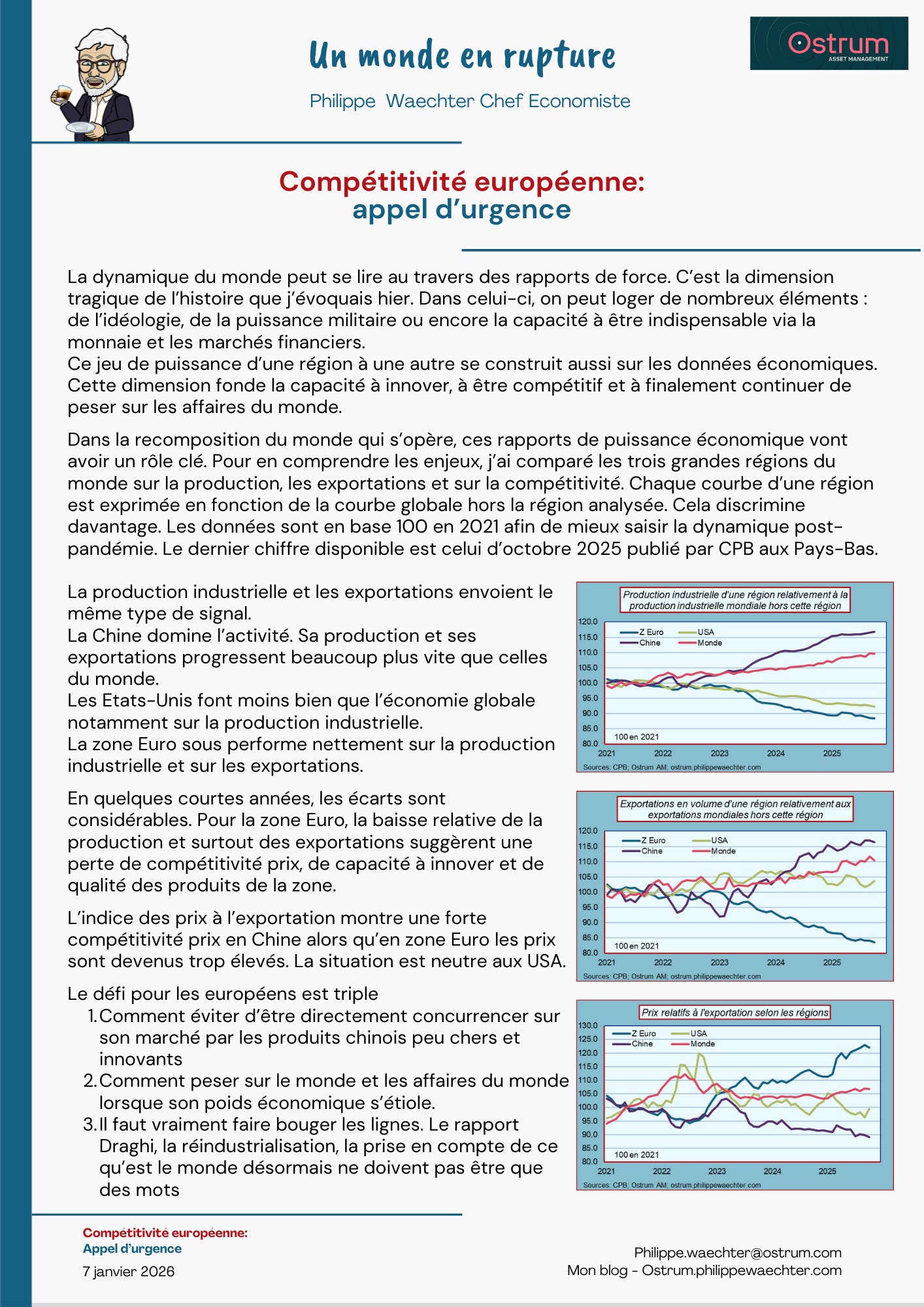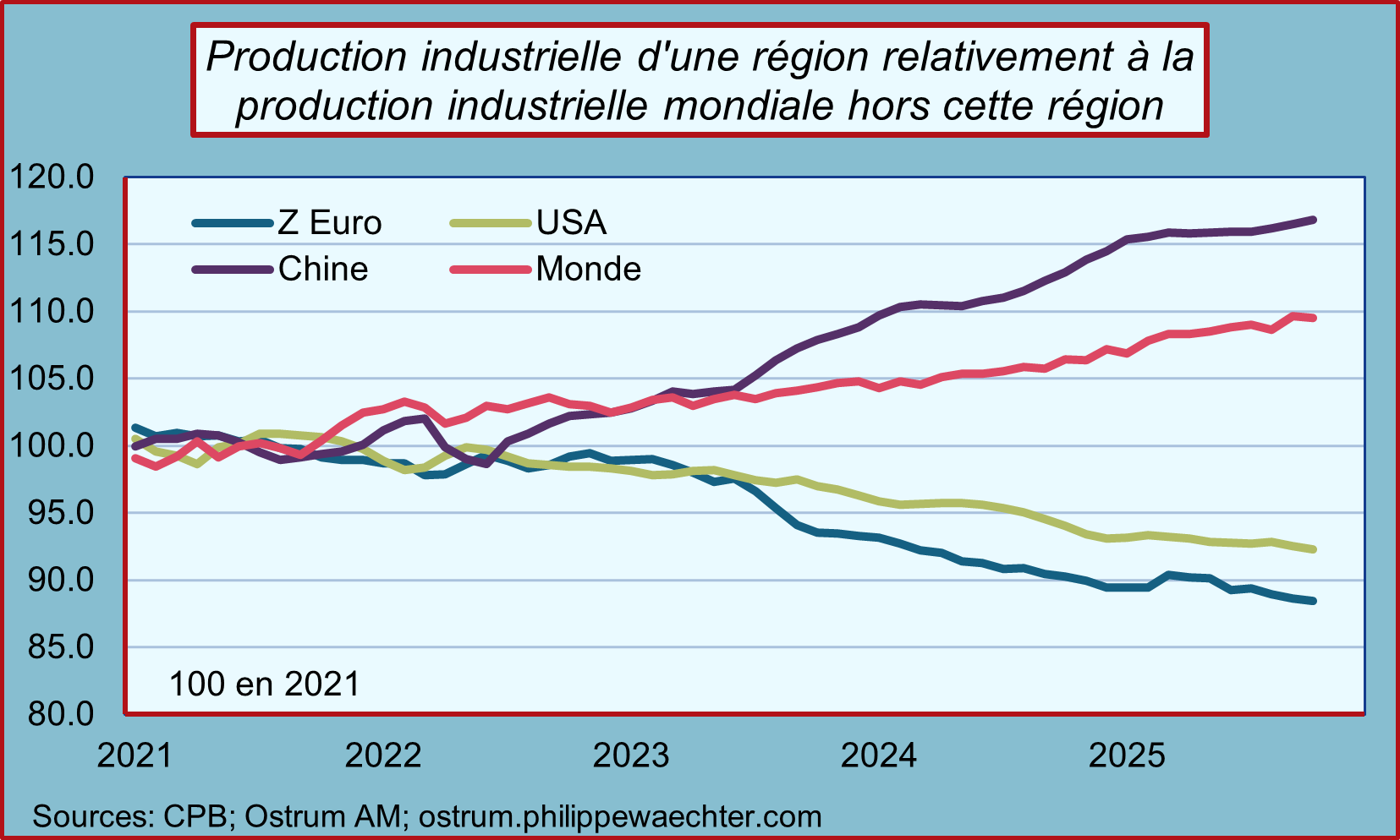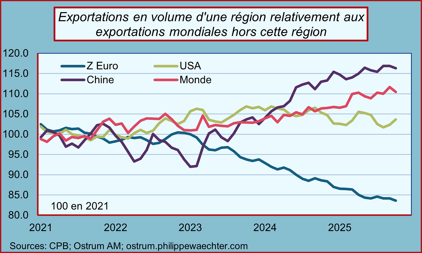 Dans la recomposition du monde qui s’opère, ces rapports de puissance économique vont avoir un rôle clé. Pour en comprendre les enjeux, j’ai comparé les trois grandes régions du monde sur la production, les exportations et sur la compétitivité. Chaque courbe d’une région est exprimée en fonction de la courbe globale hors la région analysée. Cela discrimine davantage. Les données sont en base 100 en 2021 afin de mieux saisir la dynamique post-pandémie. Le dernier chiffre disponible est celui d’octobre 2025 publié par CPB aux Pays-Bas