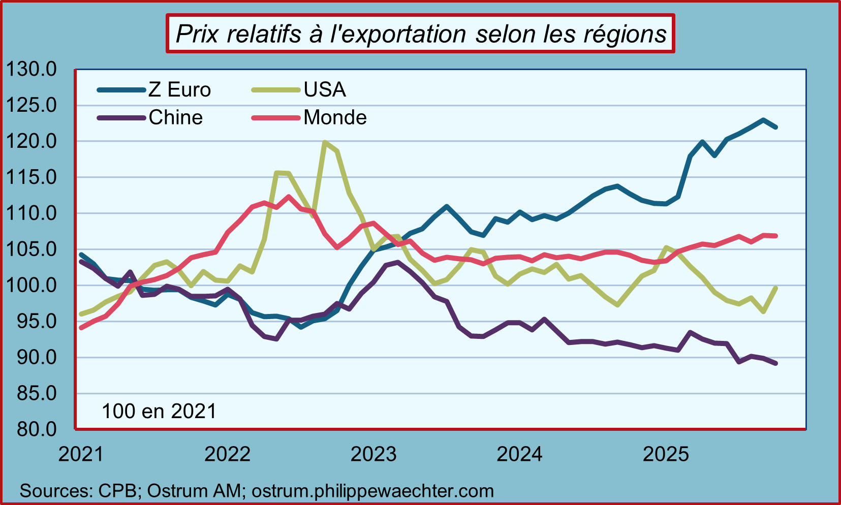 L’indice des prix à l’exportation montre une forte compétitivité prix en Chine alors qu’en zone Euro les prix sont devenus trop élevés. La situation est neutre aux USA