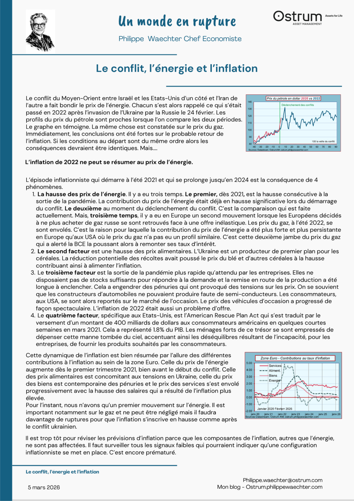 La hausse des prix de l’énergie. Il y a eu trois temps. Le premier, dès 2021, est la hausse consécutive à la sortie de la pandémie. La contribution du prix de l’énergie était déjà en hausse significative lors du démarrage du conflit. Le deuxième au moment du déclenchement du conflit. C’est la comparaison qui est faite actuellement. Mais, troisième temps, il y a eu en Europe un second mouvement lorsque les Européens décidés à ne plus acheter de gaz russe se sont retrouvés face à une offre inélastique. Les prix du gaz, à l’été 2022, se sont envolés. C’est la raison pour laquelle la contribution du prix de l’énergie a été plus forte et plus persistante en Europe qu’aux USA où le prix du gaz n’a pas eu un profil similaire. C’est cette deuxième jambe du prix du gaz qui a alerté la BCE la poussant alors à remonter ses taux d’intérêt.