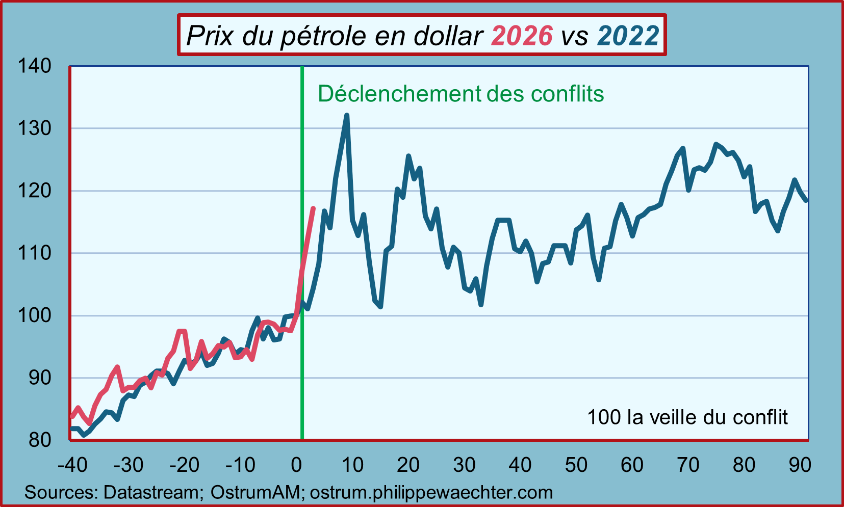 Le conflit du Moyen-Orient entre Israël et les Etats-Unis d’un côté et l’Iran de l’autre a fait bondir le prix de l’énergie. Chacun s’est alors rappelé ce qui s’était passé en 2022 après l’invasion de l’Ukraine par la Russie le 24 février. Les profils du prix du pétrole sont proches lorsque l’on compare les deux périodes. Le graphe en témoigne. La même chose est constatée sur le prix du gaz.