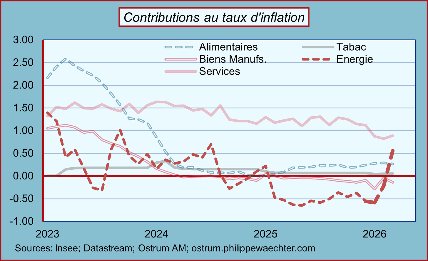 Sans surprise, c’est le prix de l’énergie qui explique ce changement de tendance. Sa contribution au taux d’inflation augmente de 0.8% en mars par rapport à février. Cela est très facilement observable sur le deuxième graphe. Le gain est d’un point depuis la fin 2025. Les hausses du prix du pétrole et du gaz se retrouvent dans ce revirement.