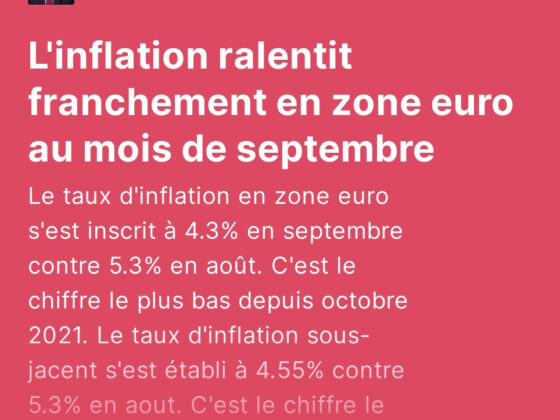 Le taux d’inflation en zone euro s’est inscrit à 4.3% en septembre contre 5.3% en août. C’est le chiffre le plus bas depuis octobre 2021. Le taux d’inflation sous-jacent s’est…